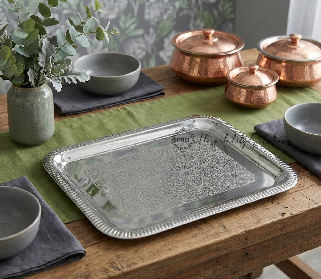 Upgrade your dining experience with the sophisticated touch of a steel serving tray. Whether you're hosting a formal dinner party, a casual gathering, or just serving breakfast in bed, a steel serving tray adds a touch of elegance and functionality to any occasion. Crafted with precision and durability, these trays are not only aesthetically pleasing but also versatile, making them an essential addition to your home.