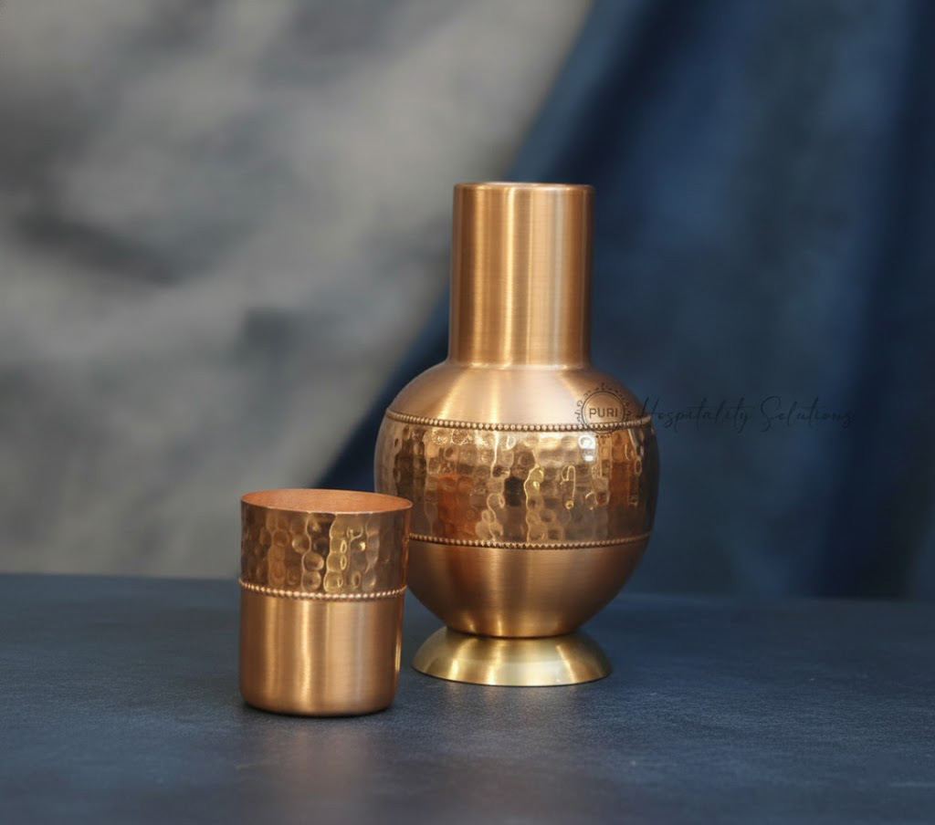 A copper water bottle is a container designed for serving and storing water. It is typically made of copper, a metal known for its conductivity and antibacterial properties. Copper water bottles are popular in some cultures due to the perceived health benefits associated with drinking water stored in copper vessels. And if you are looking for a top end water bottle , you are the right place. Ours is finest quality well finished and perfectly done with hammering work. This product is being used by luxury hotels across the world.