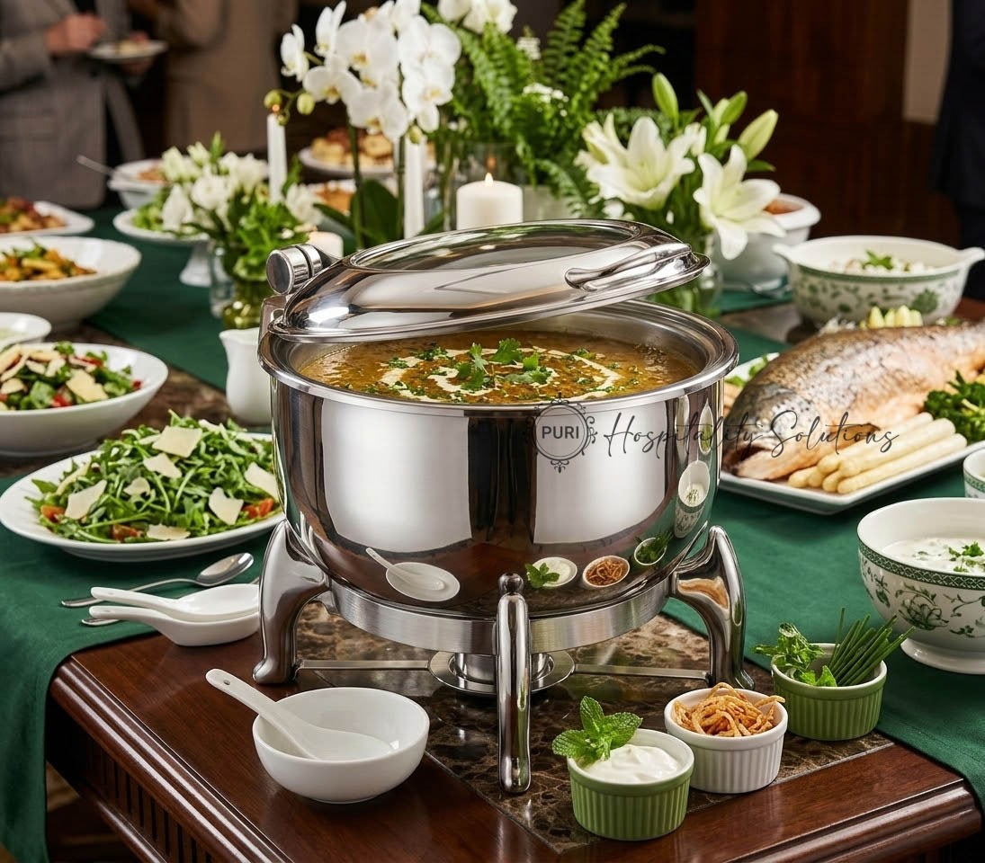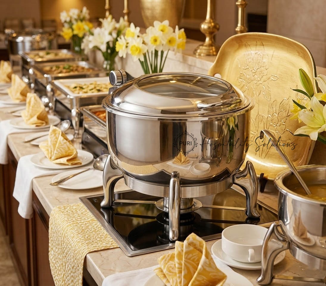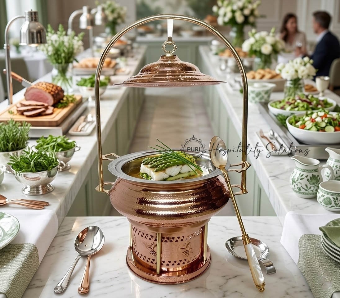 Adeline Gold Chafer Hydraulic Lid With Base Stand Stainless Steel, Brass & Glass Hammered/Polished Gold & Rose Gold PVD