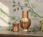 A copper water bottle is a container designed for serving and storing water. It is typically made of copper, a metal known for its conductivity and antibacterial properties. Copper water bottles are popular in some cultures due to the perceived health benefits associated with drinking water stored in copper vessels. And if you are looking for a top end water bottle , you are the right place. Ours is finest quality well finished and perfectly done with hammering work. This product is being used by luxury hotels across the world.