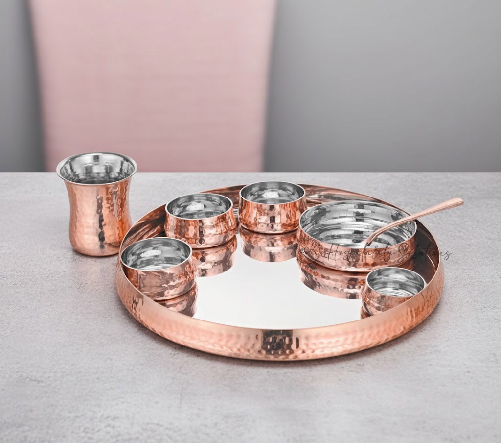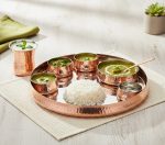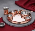 1 Chutney Bowl 6 x 3 cm, 1 Glass 250 ml 8 x 10 cm, 1 Rice Bowl 12 x 3 cm, 1 Spoon 18 x 4 cm, 1 Thali 33 x 4 cm, 3 Veg Bowl 7 x 3.5 cm